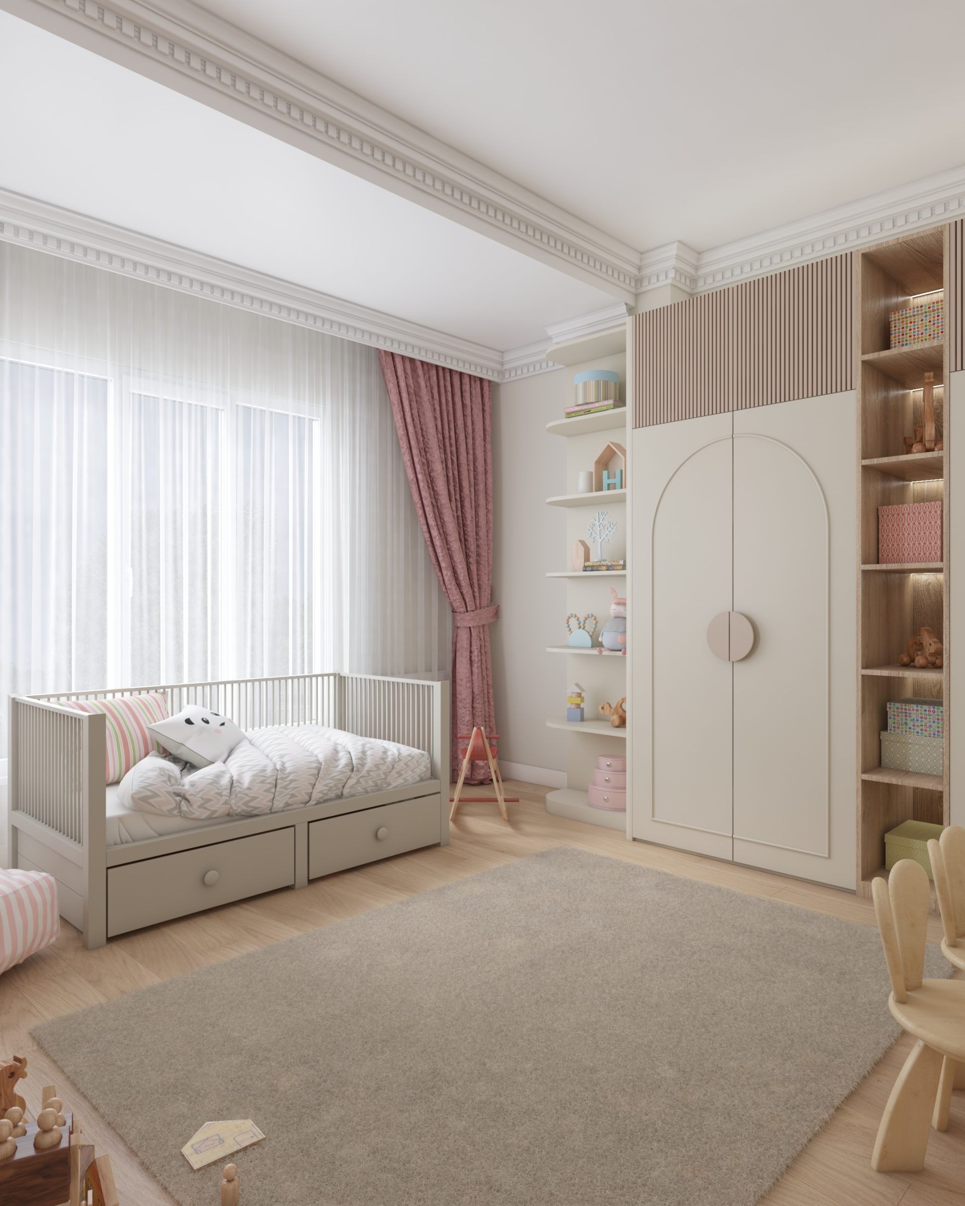 4 yaşındaki bir kız çocuğunun hem mevcut ihtiyaçlarını karşılayacak hem de en az 12 yaşına kadar değişen gereksinimlerine uyum sağlayabilecek fonksiyonel ve estetik bir yaşam alanı sunma amacına yönelik tasarladık.